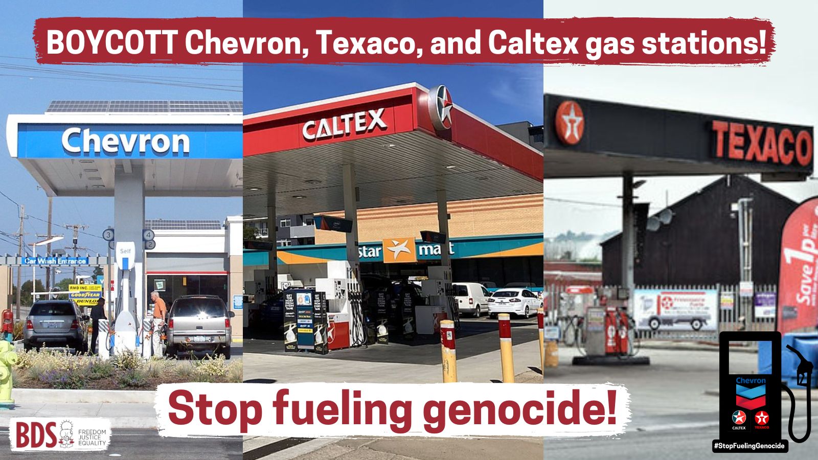 글로벌 보이콧, 투자철회 및 제재 운동을 이끄는 팔레스타인 최대 연합인 팔레스타인 BDS 국가위원회(BNC)는 쉐브론, 텍사코, 칼텍스 가스/석유 주유소에 대한 소비자 보이콧에 참여함으로써, Chevron에서 매각하기 위한 진행 중인 캠페인 외에도 거대 화석연료 기업 쉐브론 주유소 보이콧 캠페인을 확대할 것을 촉구합니다.