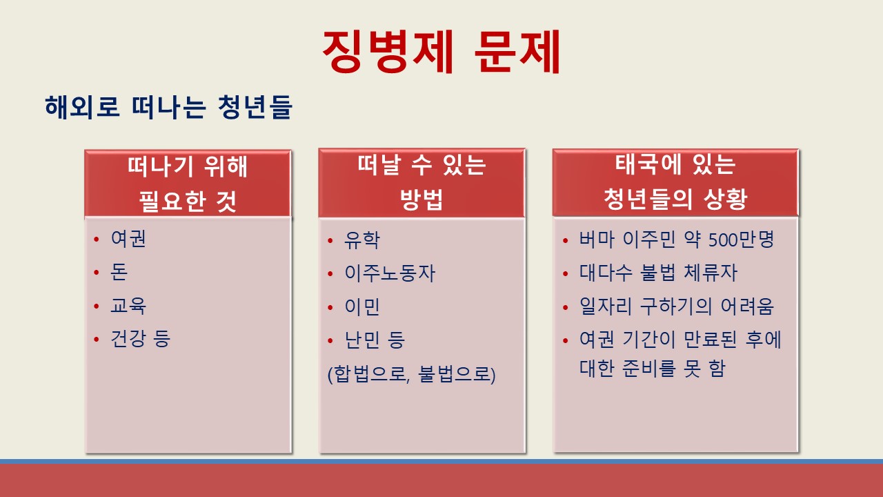 미얀마 청년들이 언제 제자리로 다시 돌아갈 수 있을까요? 4년 전부터 미얀마 청년들은 선택권을 잃어버렸습니다. 청년들은 하고 싶어서 시민불복종운동, 무장투쟁, 지하 운동 등에 참여한 것이 아니라 군부를 의한 쿠데타가 일어났기 때문입니다. 학교, 직장, 농촌, 마을에 있어야 하는 청년들이 집과 직장에 떠나야 했고 감옥에 갇히고 전투에 나서야 했습니다. 또한 수배자로 사는 청년들, 투쟁하다가 장애인이된 청년들, 투쟁하다가 세상에 떠난 청년들도 많습니다. 수많은 청년들이 집과 직장에 떠나고 있는 가운데 2024년 2월에 군부는 갑작스럽게 강제 징집을 실행했습니다. 군부의 징병제는 청년 누구든지 강제로 동원할 수 있기 때문에 투쟁하지 않는 평범한 청년들까지 태국, 한국, 일본 등의 다양한 나라들로 도망가게 하고 있습니다. 2021년 쿠데타 이후 이주노동자, 유학생 등으로 나라에 떠난 청년들도 많지만 징병제 때문에 더 많은 청년들이, 게다가 그 청년들의 가족들까지 나라에 떠나고 있는 상태입니다. 한국, 미국 등 해외로 떠난 것이 최선의 방법이 아니라고 생각하는 청년들은 미얀마 평화를 계속 지키고 있으며 싸우하고 있습니다. 국내에서 힘을 모아 스스로의 힘으로 만든 해방이 진짜 해방이라고 믿는 청년들은 혁명을 포기하지 않고 첫마음을 그대로 열심히 살아갑니다.