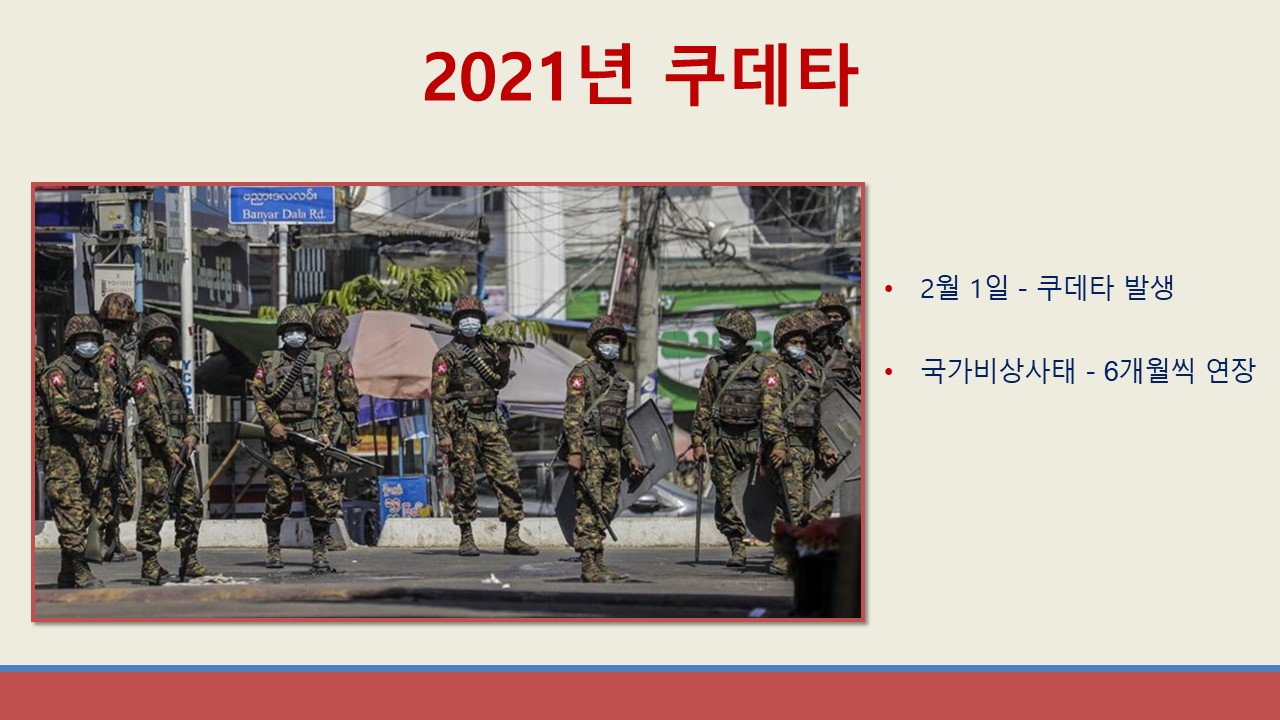 다양한 민족들이 함께 살고 있는 나라, 지하자원이 많은 나라, 내전이 크게 일어나고 있는 나라, 청년들이 떠나고 있는 나라. 그 나라는 바로 미얀마(버마)입니다. 미얀마는 동남아시아에 있으며 태국, 중국, 인도, 방글라데시, 라오스 등 5개 국가들과 접하고 있습니다. 1948년 영국과 일본의 식민 지배에서 벗어나 버마(미얀마)가 해방 후 연방국으로 국제 무대에 등장했습니다. 그러나 1962년에 군부를 의한 쿠데타가 일어났습니다. 군부 쿠데타는 1988년에 두 번째, 2021년에 세 번째 일어났습니다.