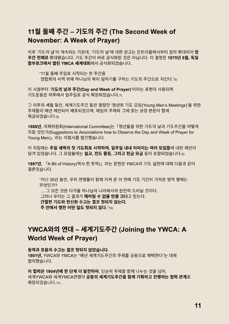 3. 1875년 8월, 독일 함부르크에서 열린 제7차 YMCA세계대회에서 “11월 둘째 주일”을 세계기도주간의 시작일로 정하기로 합의.