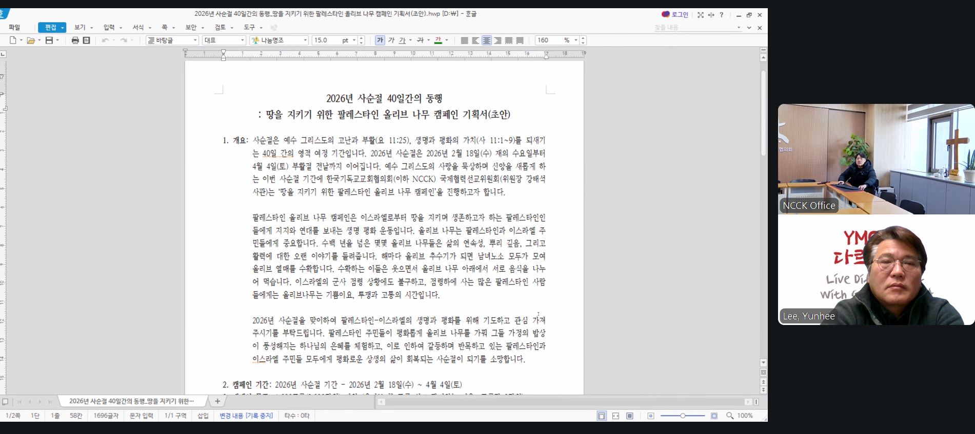 사순절 기간 동안(2026년 2월 18일 ~ 4월 4일), #한국기독교교회협의회(NCCK), #올리브나무평화한국네트워크(OTPNK)가 공동 주관으로, 한국기독교교회협의회 #국제협력선교위원회와 #고양YMCA가 함께 추진하는 [#팔레스타인 #올리브나무 #캠페인] 두 번째 준비 미팅.