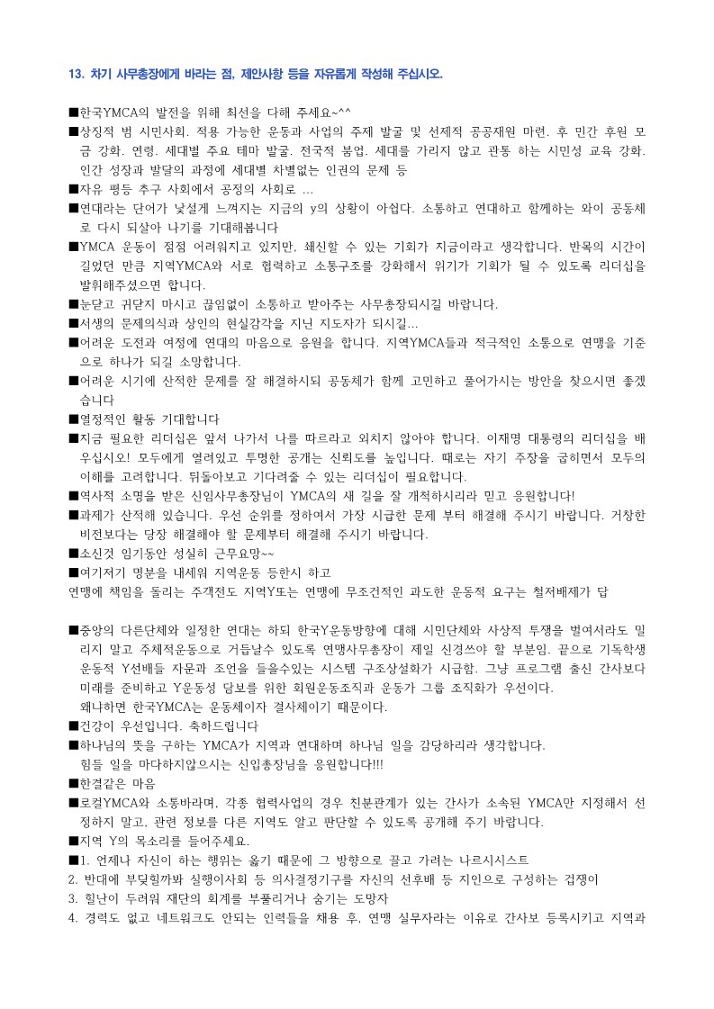 13. 차기 사무총장에게 바라는 점, 제안사항 등을 자유롭게 작성해 주십시오.
