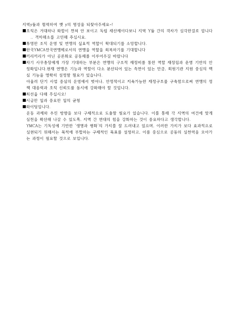 ■ 큰 일을 맡아서 어깨가 무거울거라 생각합니다. 앞으로 조금 늦게 나아가는 지역y도 좀더 신경써주시고 함께 소통하고 갈등없는 ymca가 되길 바래봅니다. 고맙습니다.